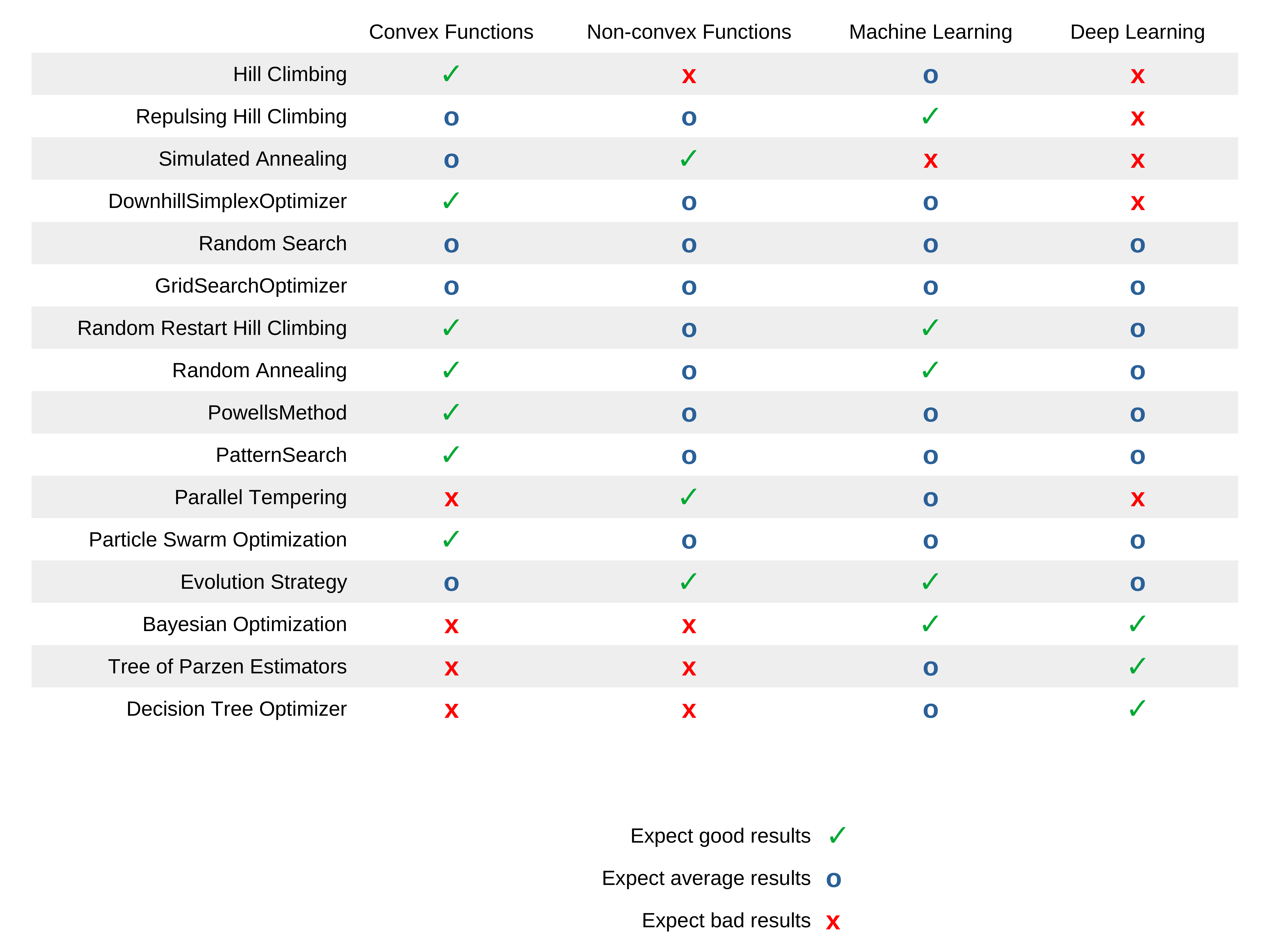 The following table shows the expected results for each optimization strategy for the given type of problems: