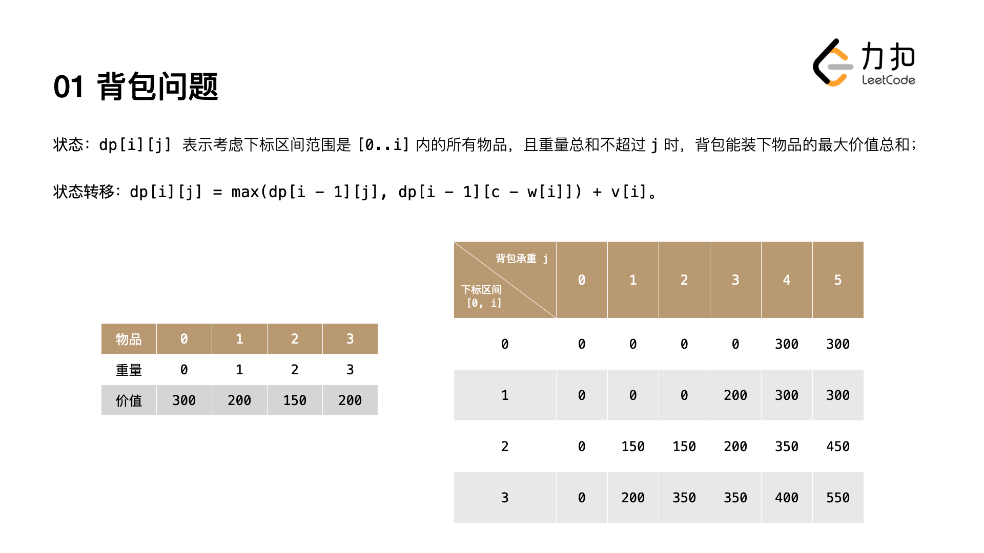 - 状态转移方程:表达了大规模问题的解与小规模问题的解的关系。